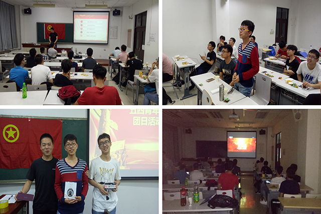 晚上七时整,团日活动正式开始。首先安全工程班团支书周睿达向大家讲解了此次团日活动的目的。他表示,之所以在5月4日这个特殊的日子组织大家参加团日活动,是为了让大家真正记住1919年那些前辈们的爱国之心,也希望大家可以在今后的学习生活中担当起民族复兴的大任。之后是五四知识竞答,各位同学积极踊跃地回答一道道和五四青年节有关的问题,气氛十分的活跃。经过激烈的比拼,三位同学对五四青年节的了解脱颖而出,分获一二三等奖,安全工程班班长徐永康为他们颁发了奖品。最后,同学们观看了电影《厉害了,我的国》。