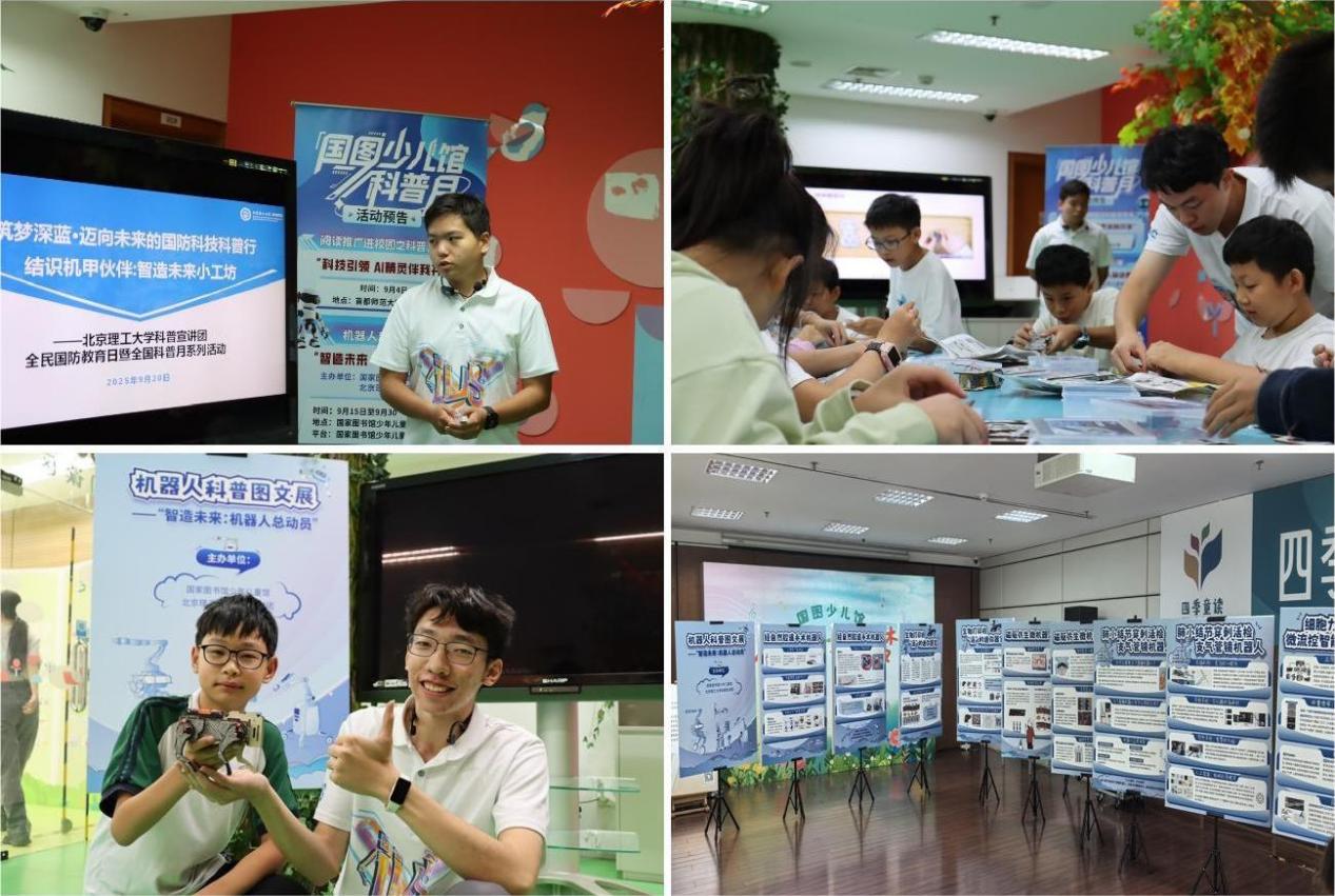 2025年9月20日上午,科普宣讲团结合九三阅兵出现的智能无人系统装备,在国家图书馆面向青少年们开展“结识机甲伙伴:智造未来小工坊”机器人专题科普讲述,并指导参加的中小学生动手体验机器人设计制作,提升青少年们科学素养。此前,由太阳成集团tyc122cc兵器智能系教师代表提供的“制造未来:机器人总动员”图文展正在国家图书馆展出。